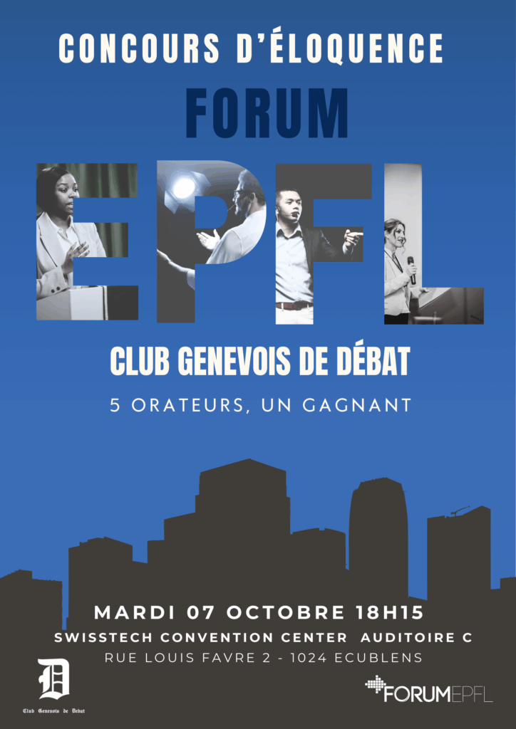 Cette année, le concours aura lieu le mardi 7 octobre, 18h15 à Ecublens au SwissTech Convention Center. Cet évènement est organisé en partenariat avec le Club Genevois de Débat.